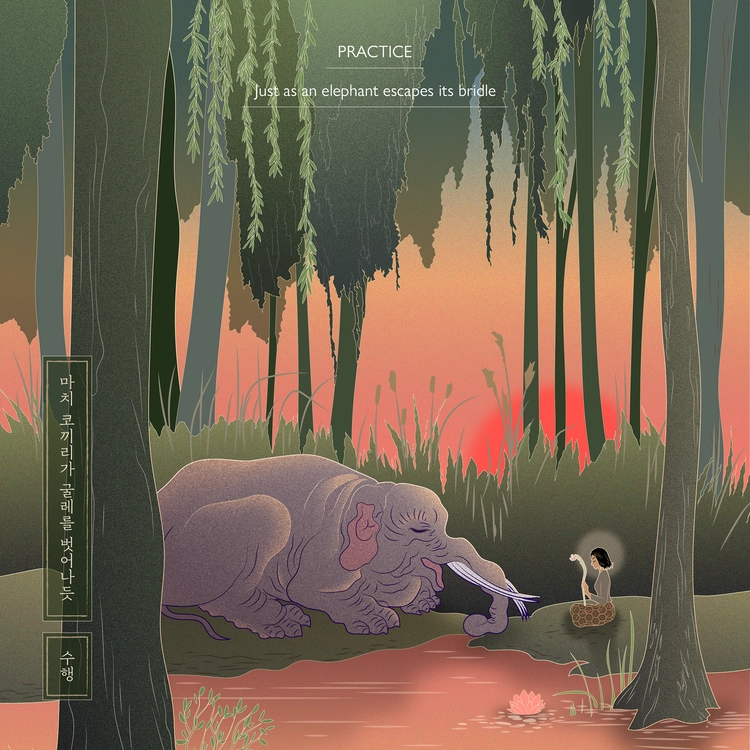 [마음의 숲: 수행]에 나오는 이미지는 실천, 수행, 서원의 보현보살을 상징하는 도상들로 구성됩니다.