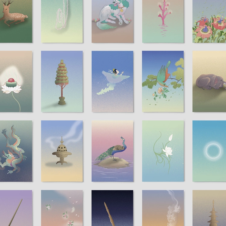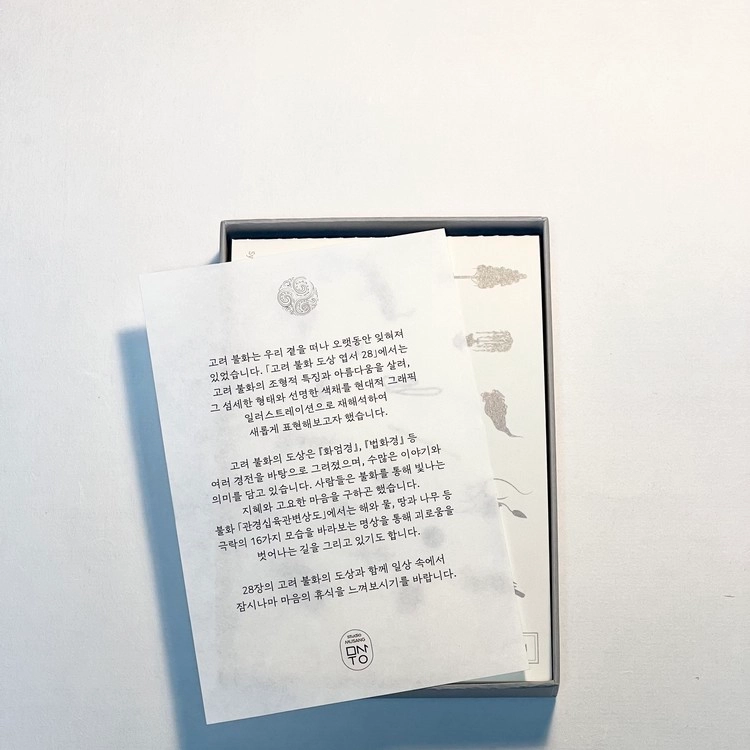 엽서 앞면에는 고려 불화의 도상 형태를 바탕으로 재해석한 28가지 일러스트레이션이 표현되고, 뒷면에는 그 의미와 관련된 경전이나 시 구절이 쓰여져 있습니다.